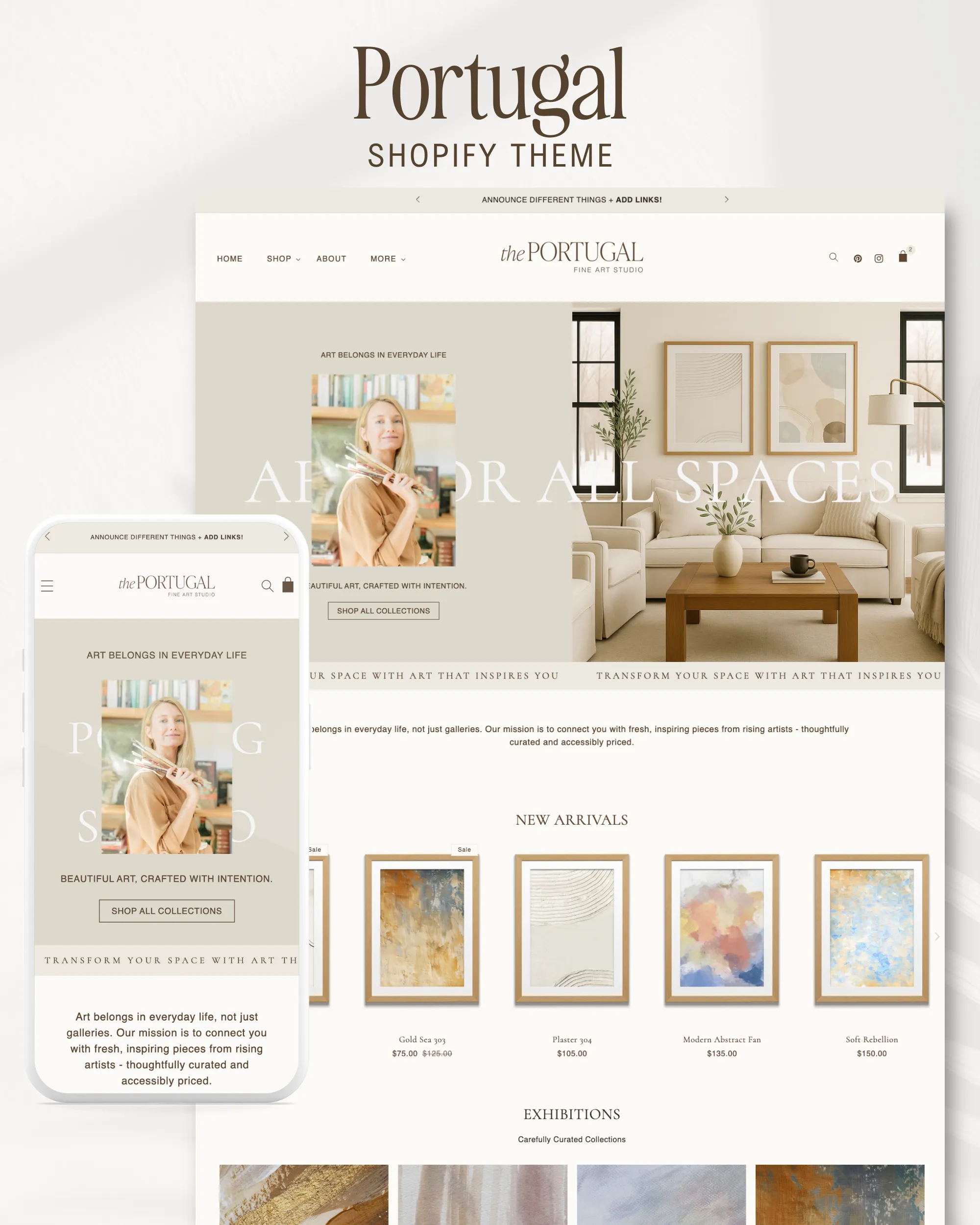 Portugal is an artist Shopify theme created for creatives who want a clean, modern space to showcase and sell their work online. Soft layouts, neutral tones, and gallery-focused sections create a browsing experience that feels calm and approachable, allowing your artwork to remain the focal point. Every section is designed to support visual storytelling while keeping the experience simple and easy to navigate.