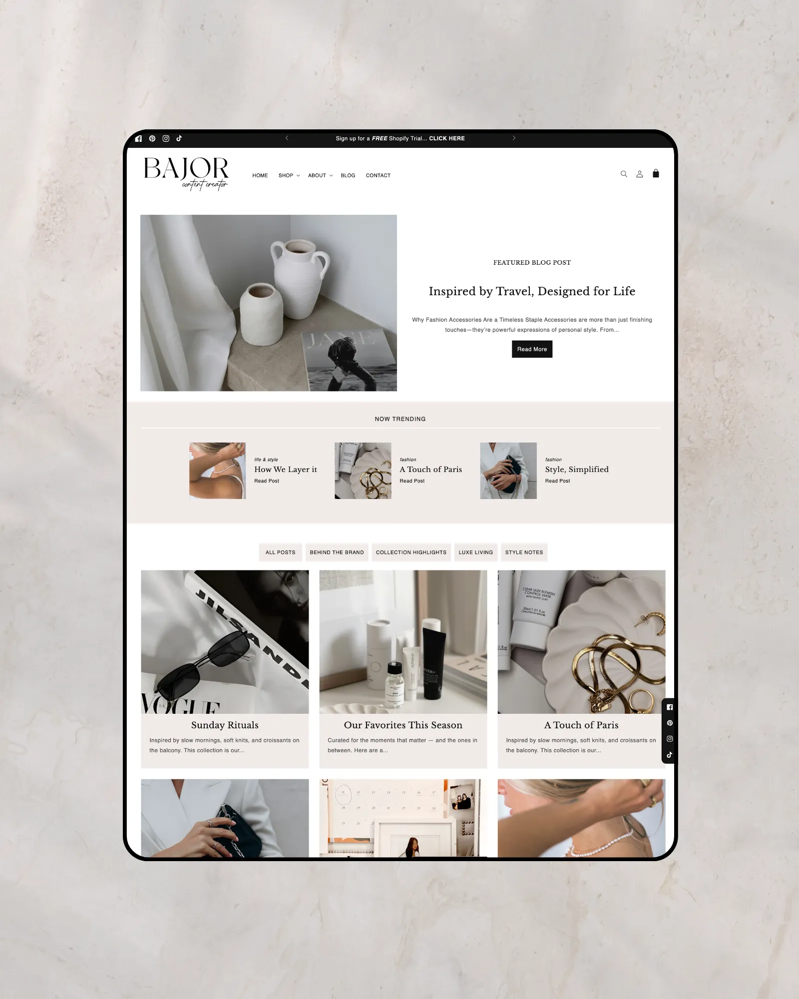 Designed for modern brands who believe less truly is more, Bajor is a refined minimal Shopify theme template with an editorial edge and effortless sophistication. Clean layouts, intentional spacing, and imagery-first sections give your products room to breathe – while guiding shoppers through your collections with ease. The result? A storefront that feels calm, curated, and undeniably premium.