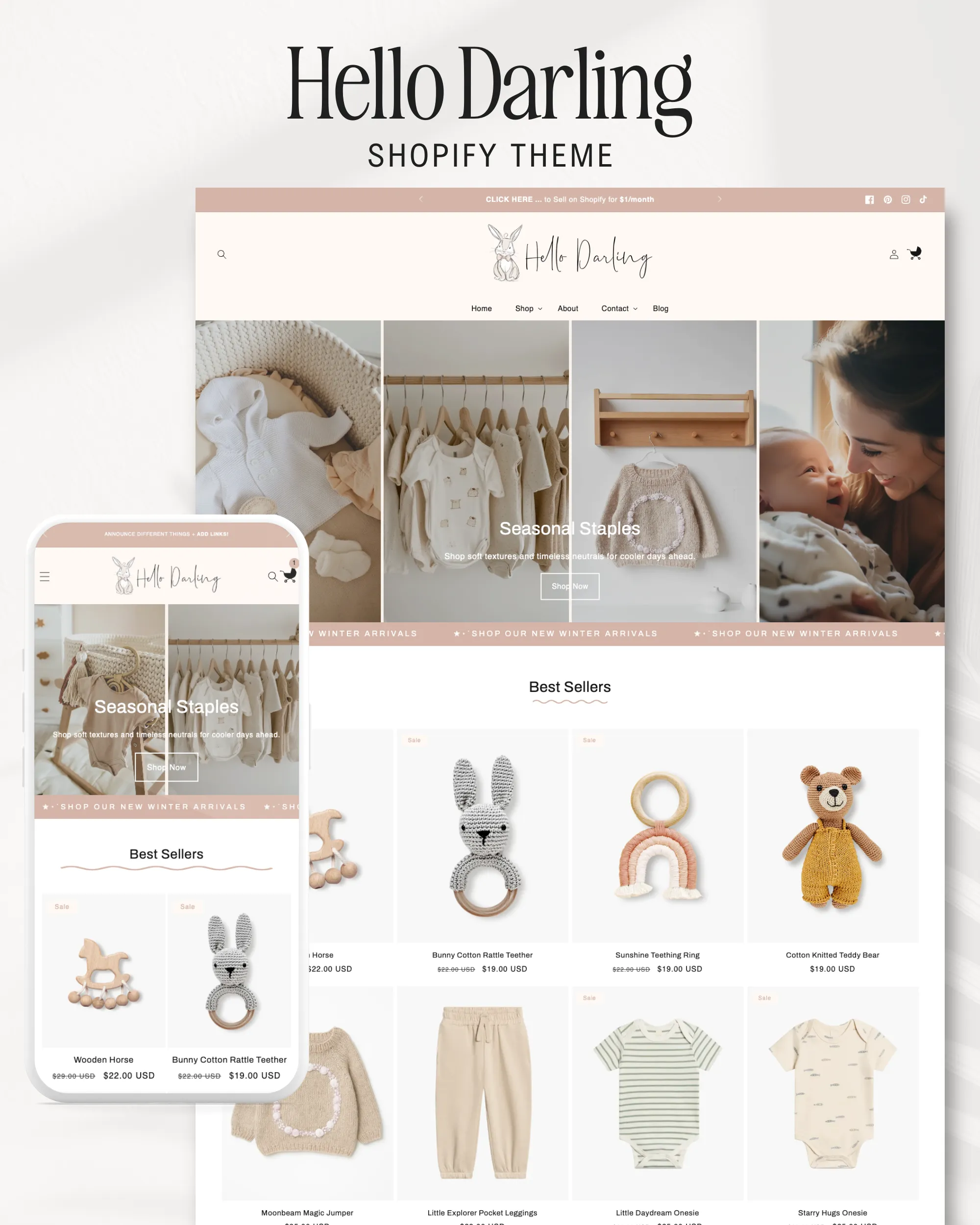 Children’s Boutique Shopify Theme created for brands who want their shop to feel soft, heartfelt, and beautifully intentional. Hello Darling blends warm neutrals, gentle layouts, and delicate details into a storefront that feels calm and comforting from the first scroll. Every page feels thoughtful. Every product feels special. The result is a boutique that feels trustworthy, timeless, and easy to fall in love with.