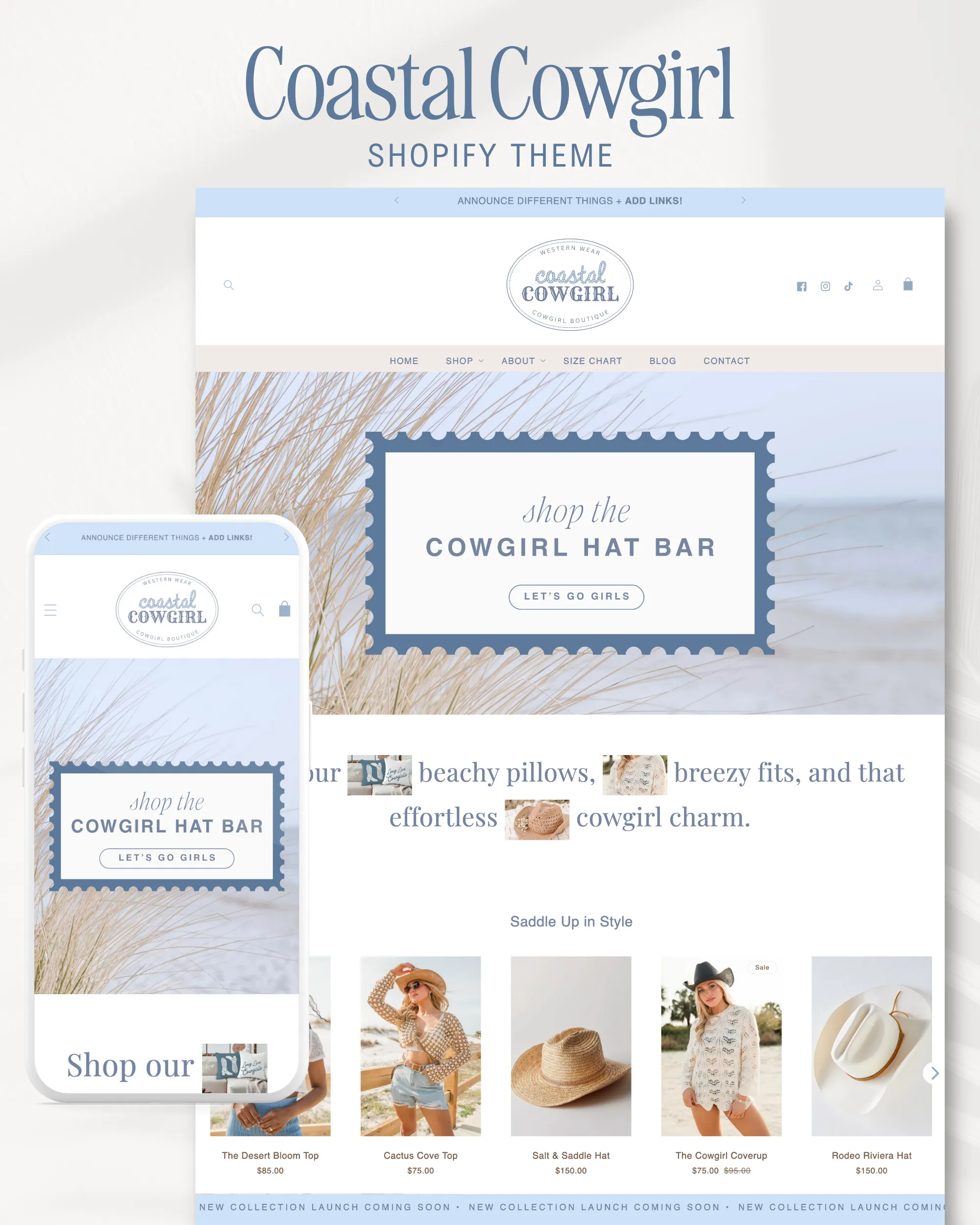Coastal Cowgirl is a Western Boutique Shopify Theme designed for fashion forward brands, cowgirl inspired shops, and lifestyle boutiques who want their website to feel fun, elevated, and full of personality. The design blends soft Western details with modern polish to create a storefront that feels stylish without feeling overdone.