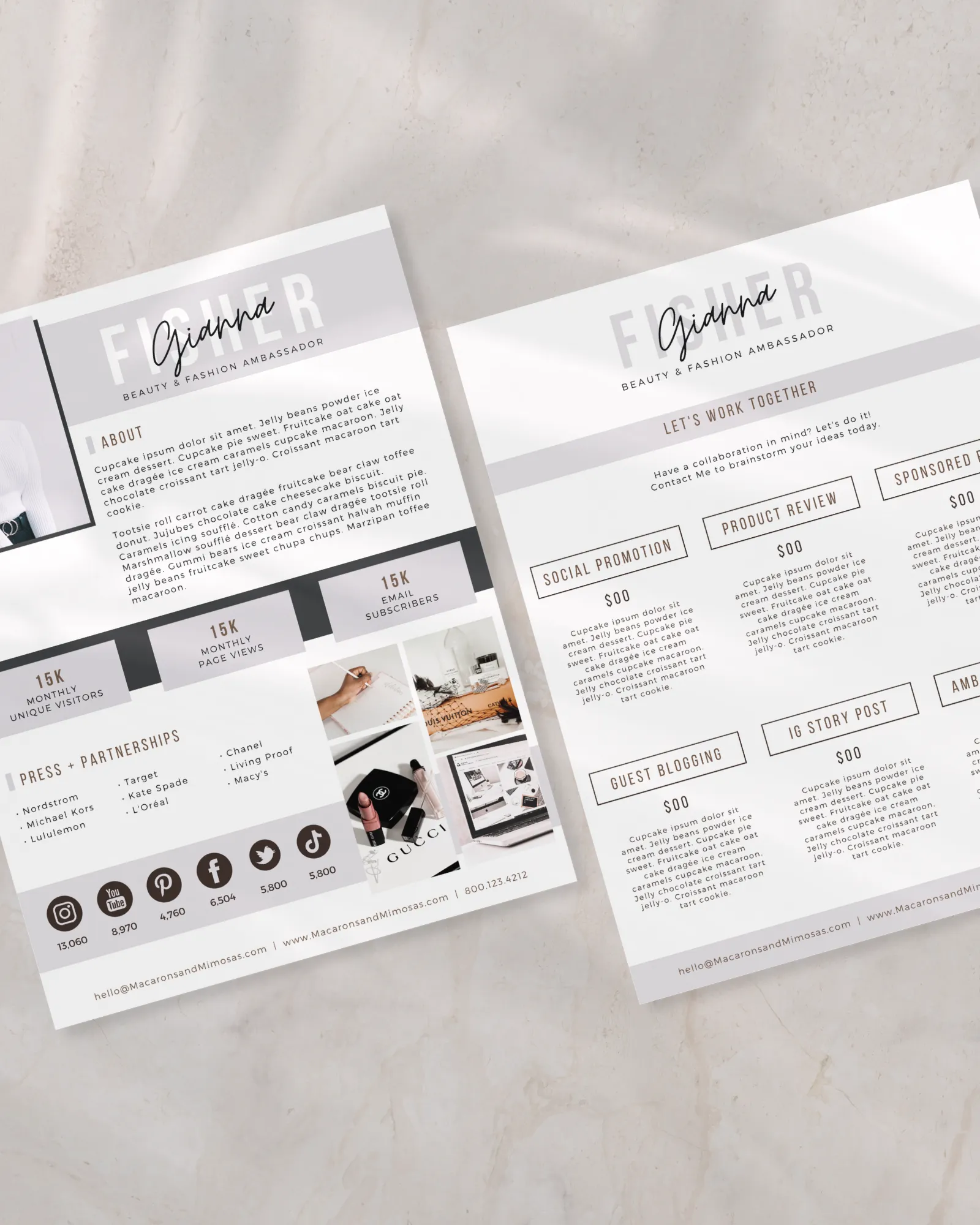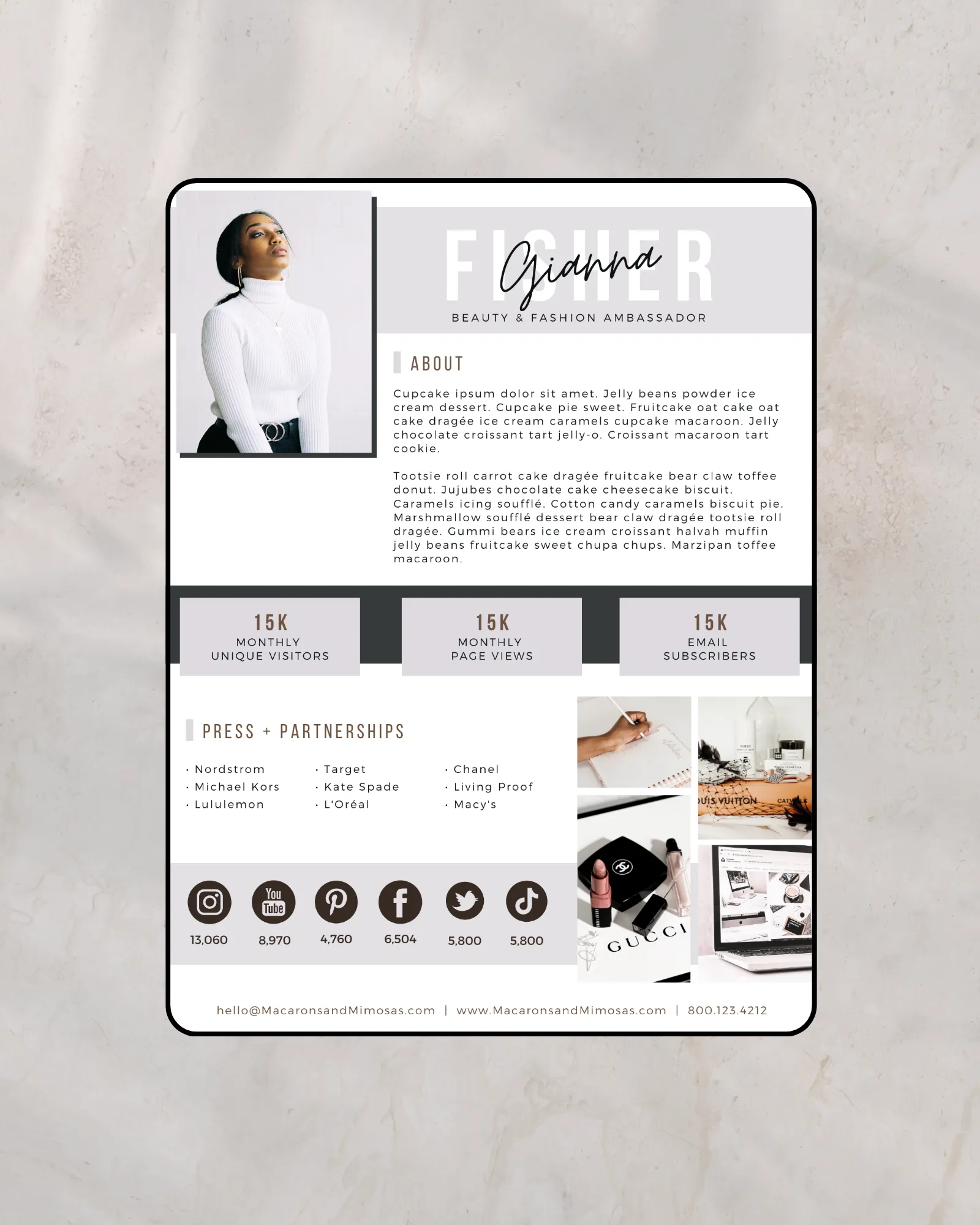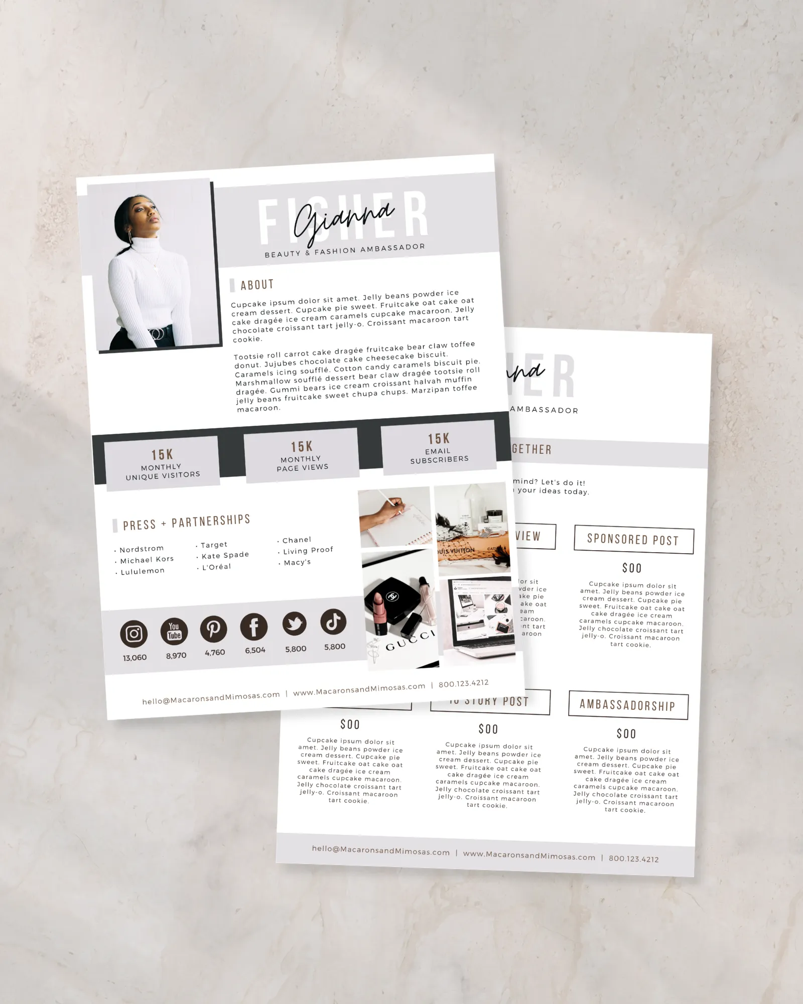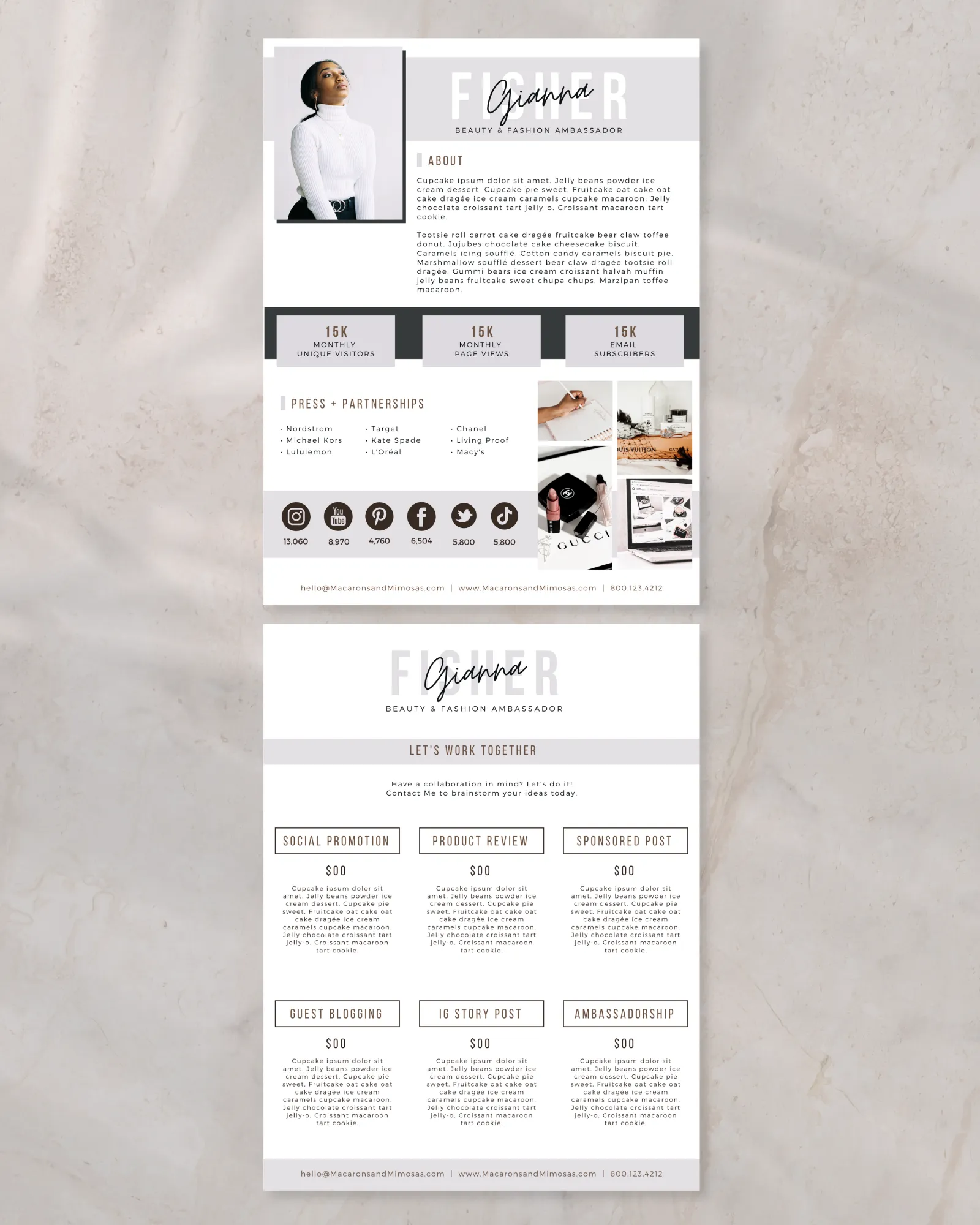 Need a SUPER EASY to use this Influencer Press Kit Template? This Canva Media Kit Template comes in a blank slate so that you can place your images and logo in the spaces as seen in the sample above.