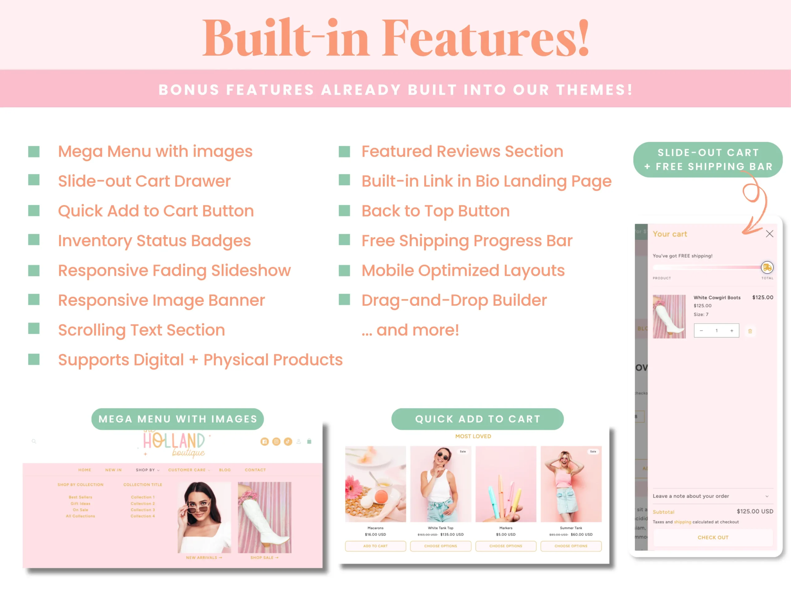 Are you looking for enchanting pastel boutique website templates for your e-commerce shop? Holland is perfect shades of pastel pink and white branding for planners, journaling, printables, apparel and more. Customize it to suit your business Designed with Shopify 2.0 in mind.