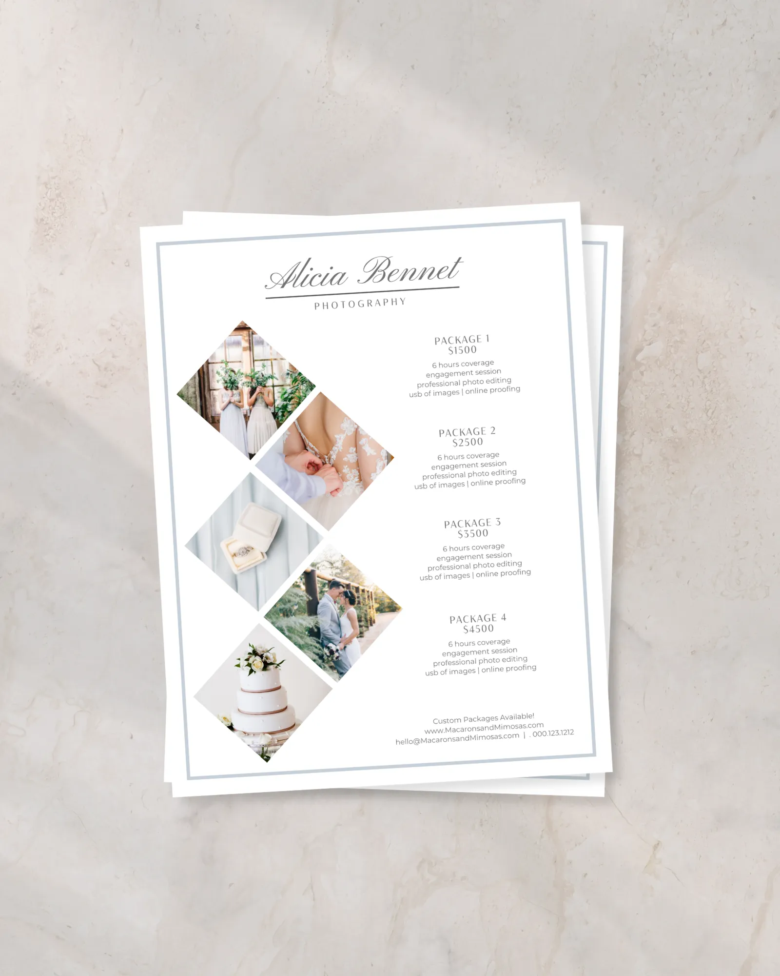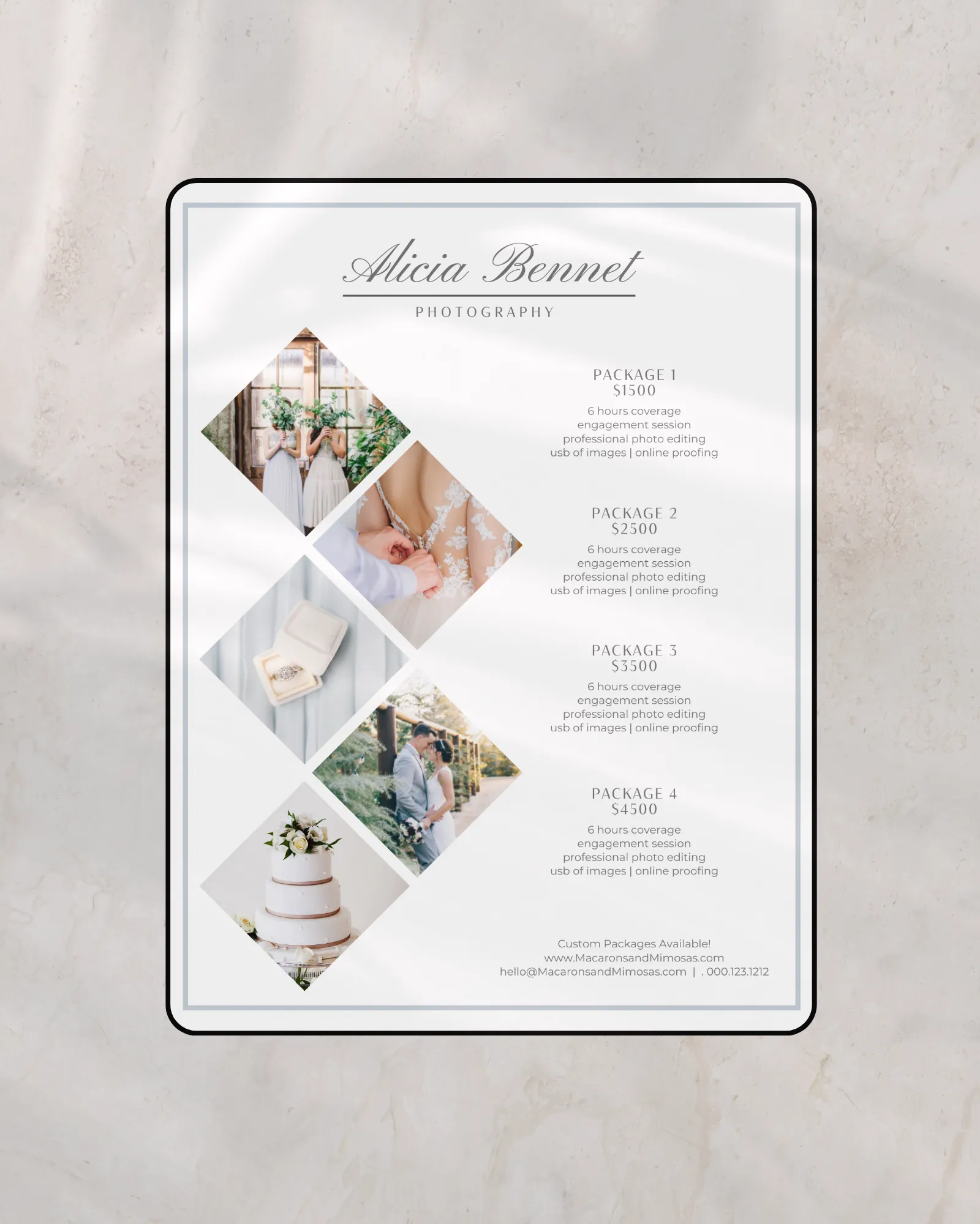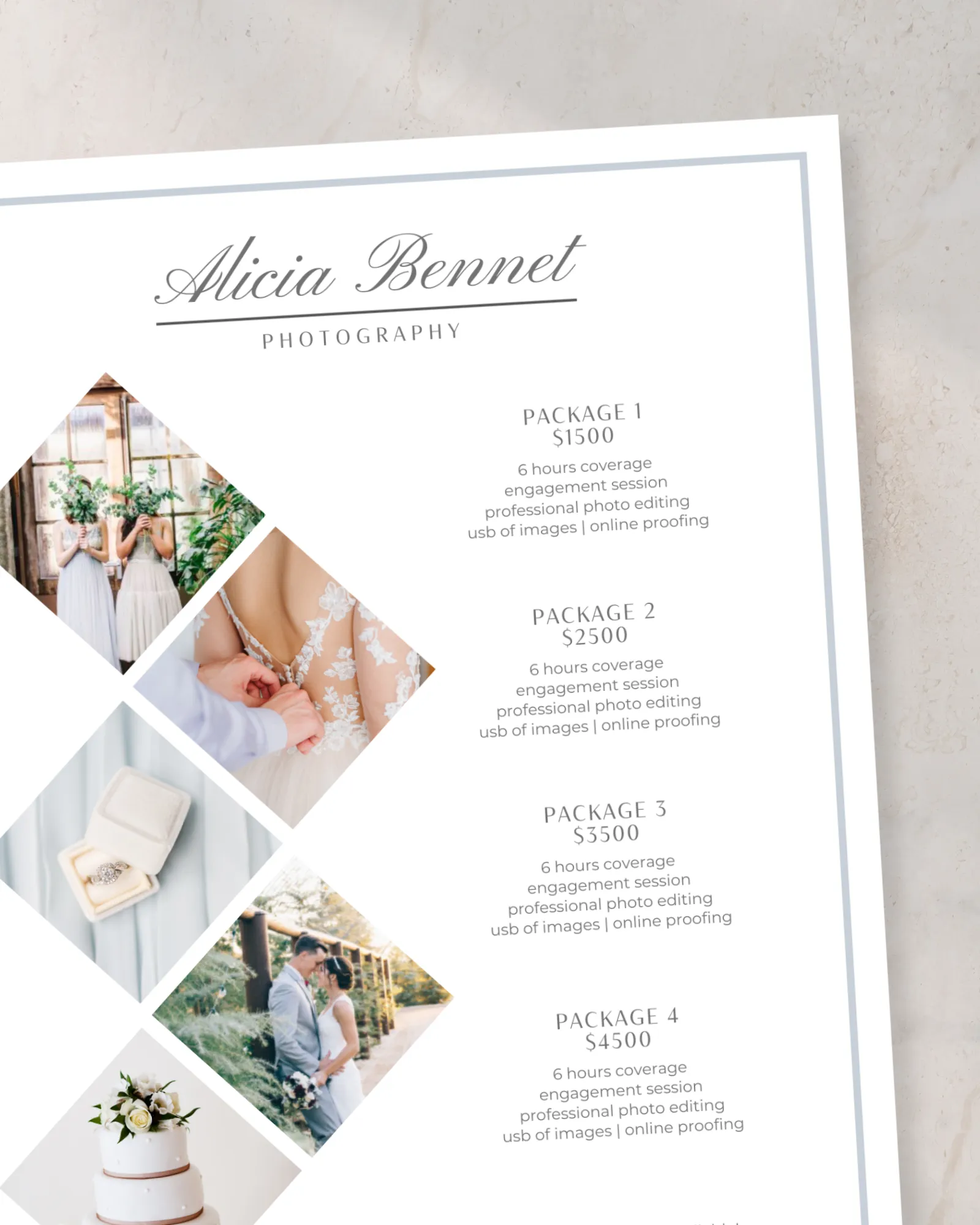 Many photographers send pricing through messages or plain documents, which can feel unclear or inconsistent. A professional rate sheet helps present your services in a clear, intentional way that builds trust and communicates value more effectively.