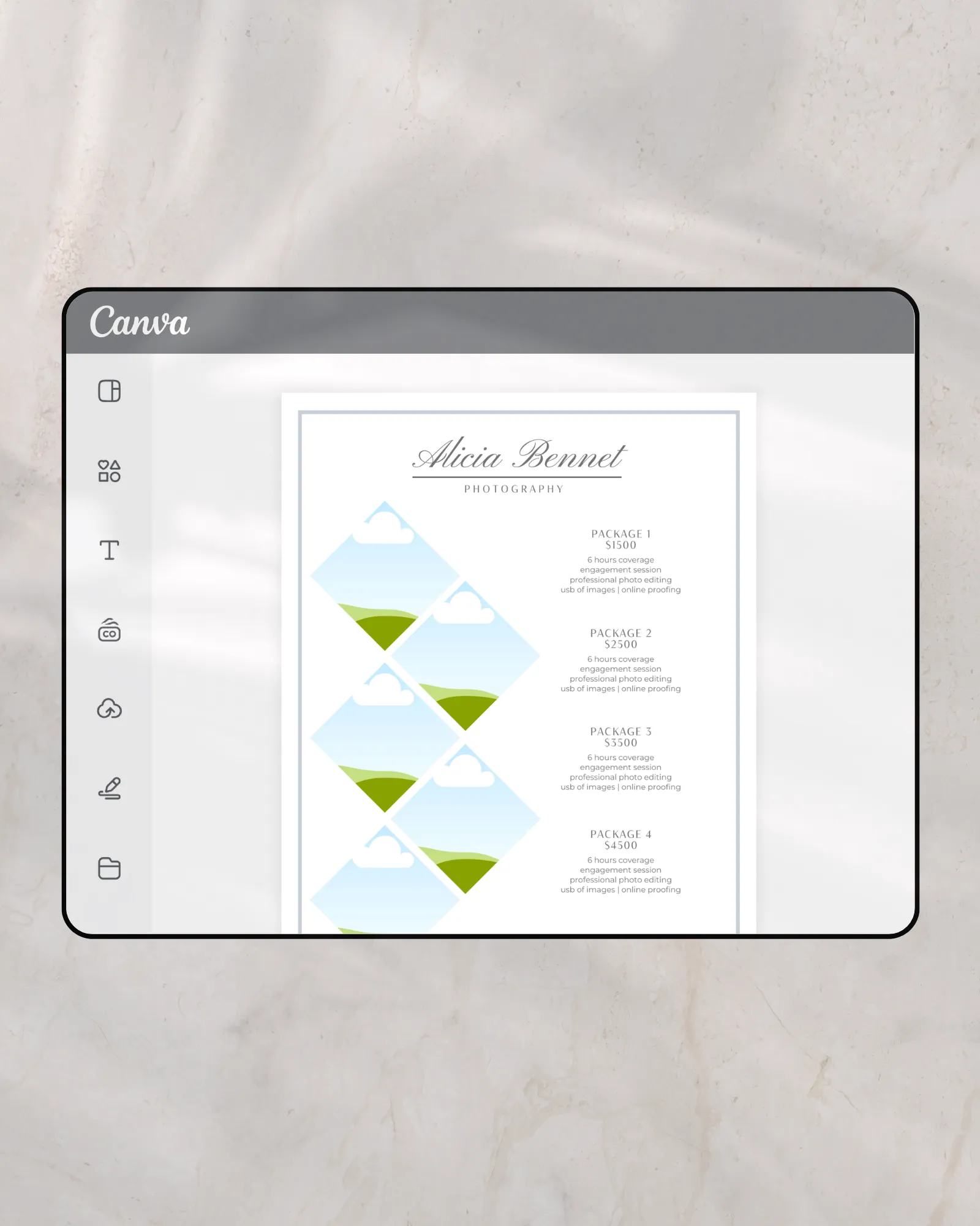 • Editable Canva photography rate sheet template