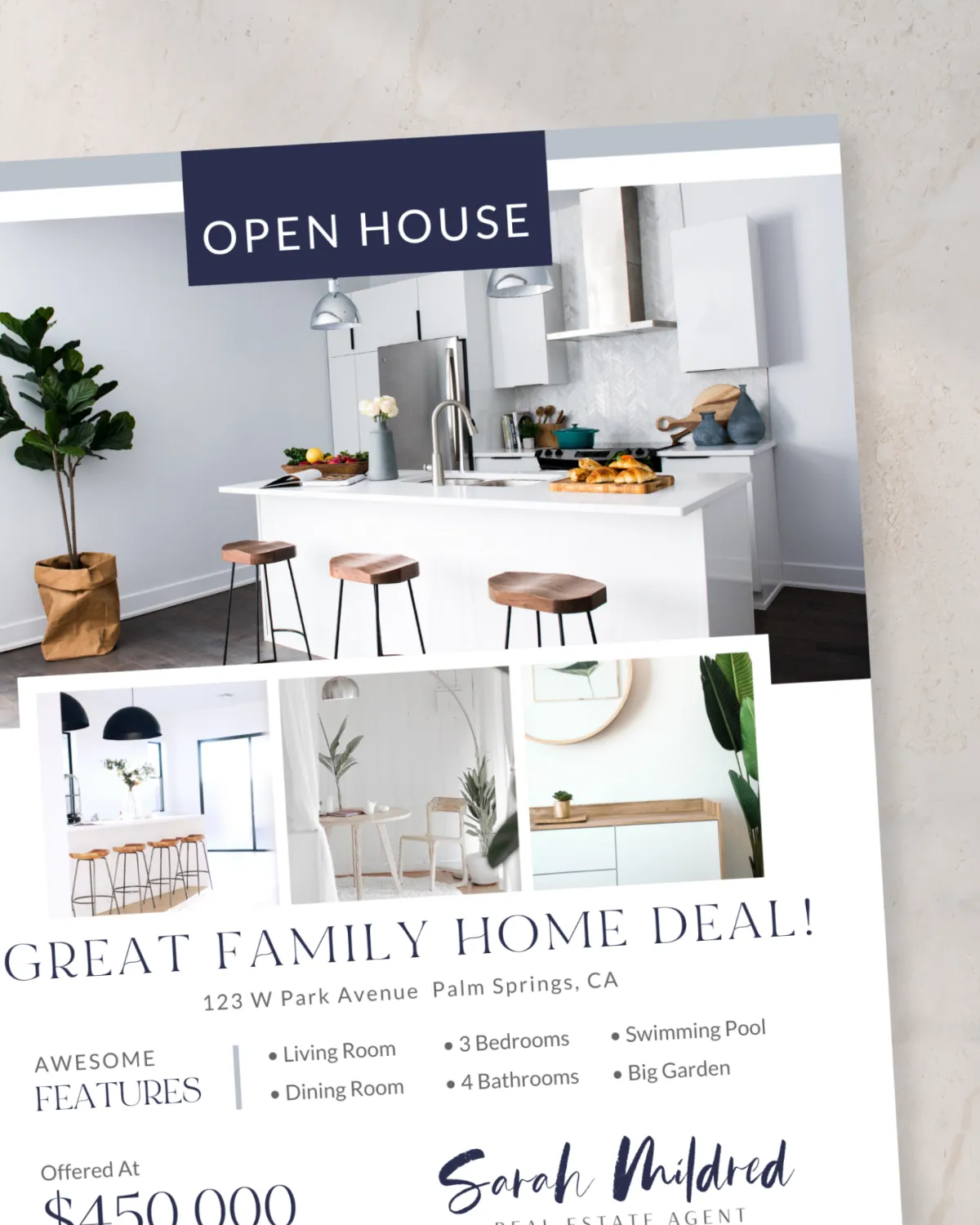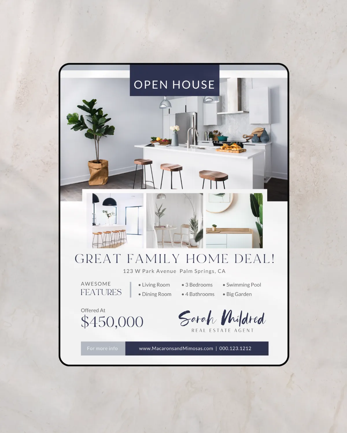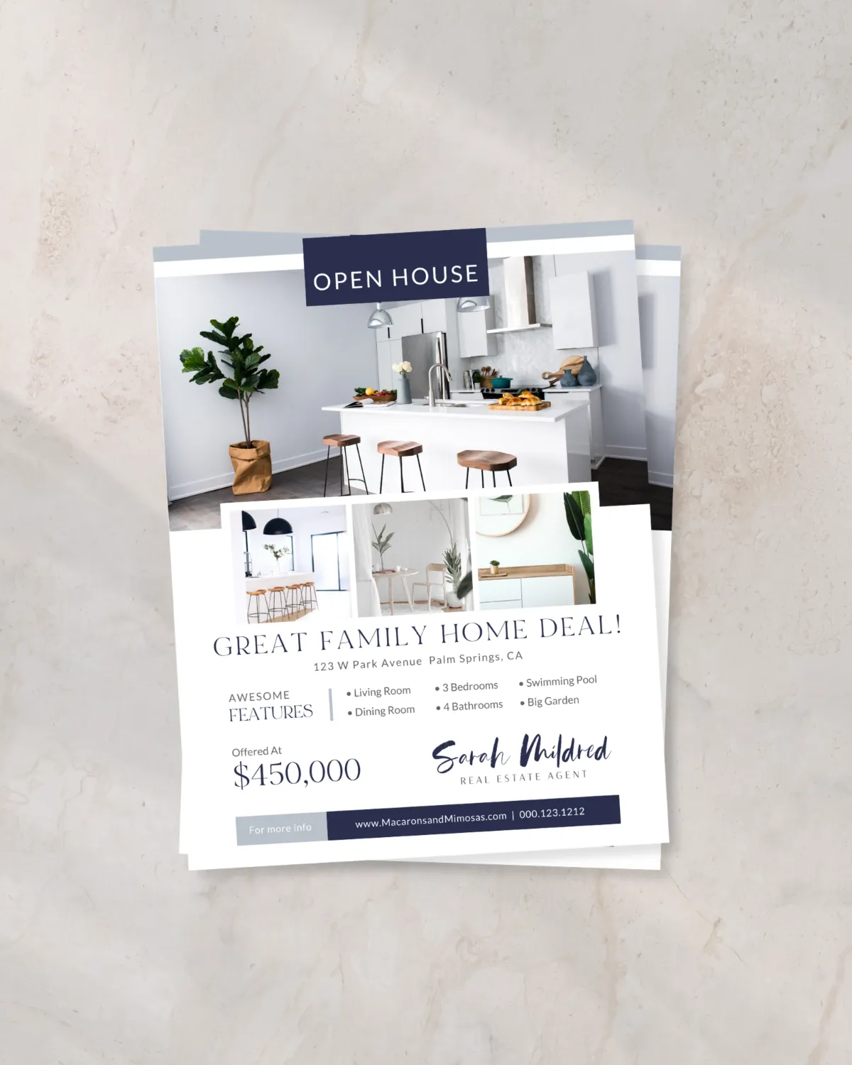Promote your upcoming property showings with this professional open house flyer printable designed for realtors and brokers. This clean and modern flyer layout highlights property photos, home details, and open house information in a polished format that helps attract potential buyers.