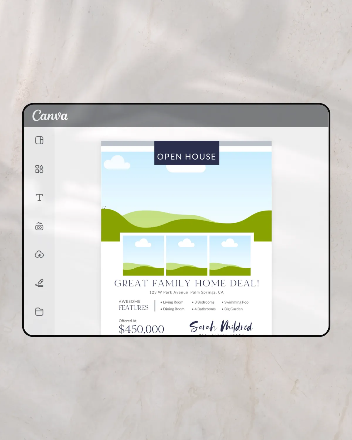 The flyer is fully editable in Canva, making it easy to update photos, text, colors, and contact details to match your listing or brokerage branding. Simply customize the template, download your design, and use it as a printable flyer for showings, neighborhood marketing, or digital promotion on social media and email.