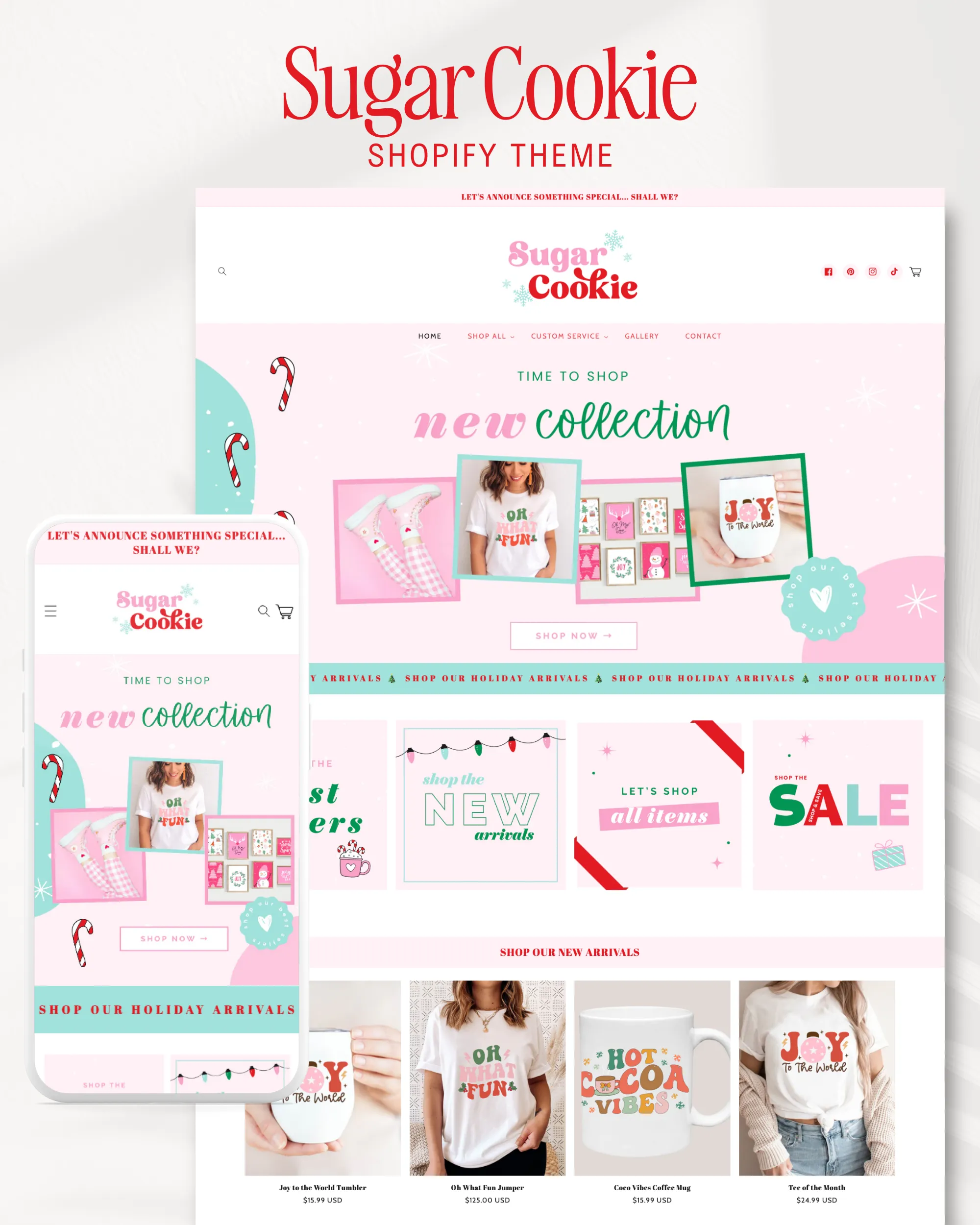 Whether you sell apparel, gifts, mugs, stickers, printables, digital products, or seasonal collections, Sugar Cookie helps you create a holiday storefront that feels joyful, memorable, and perfectly styled for Christmas shoppers.