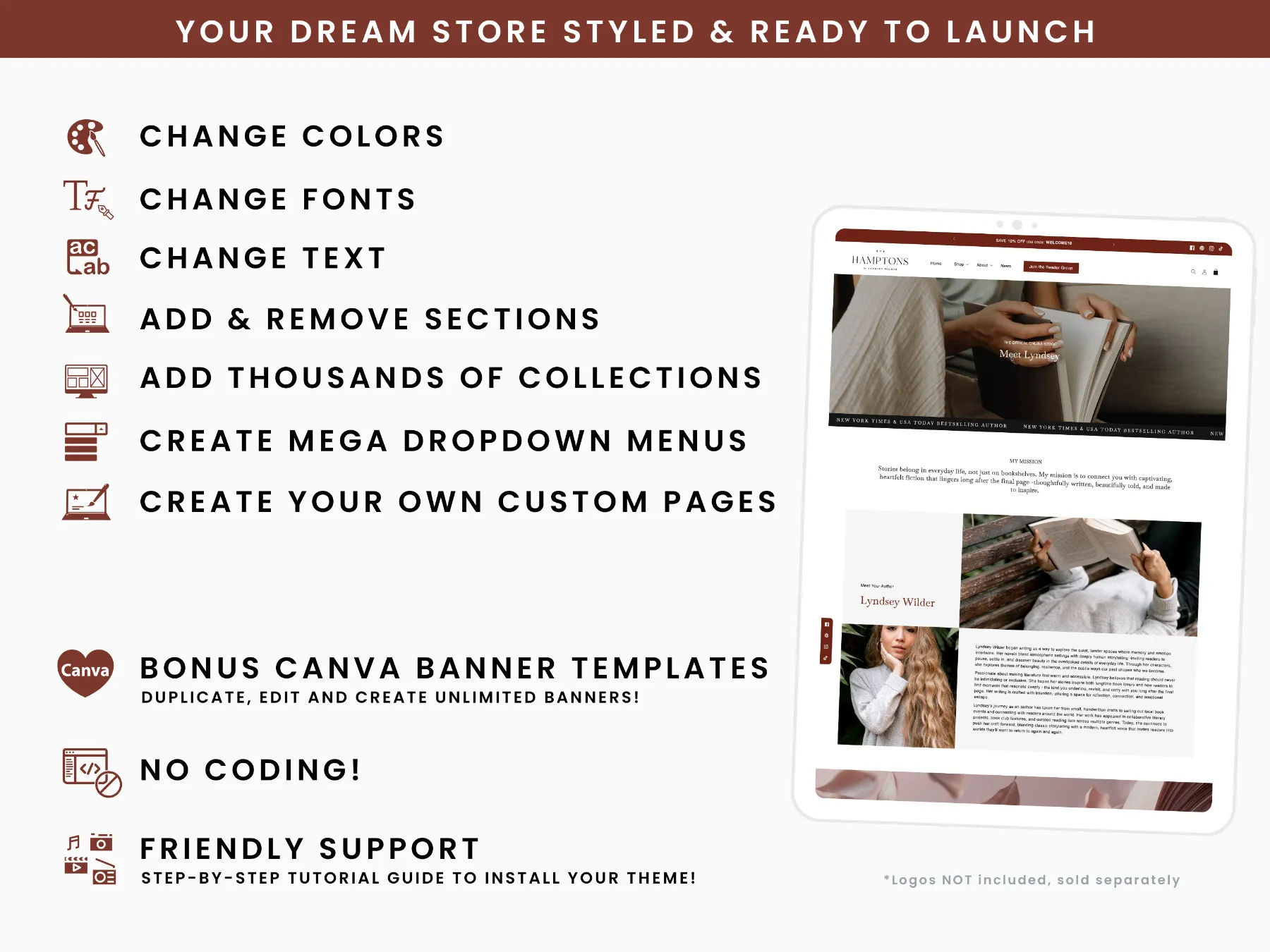 We will provide you with the theme files, video tutorials and all the tools to get your site set-up. Our templates are created for use with the Shopify platform. All of our banners and graphics are fully editable in the Canva website app. You will also need a FREE canva account.
